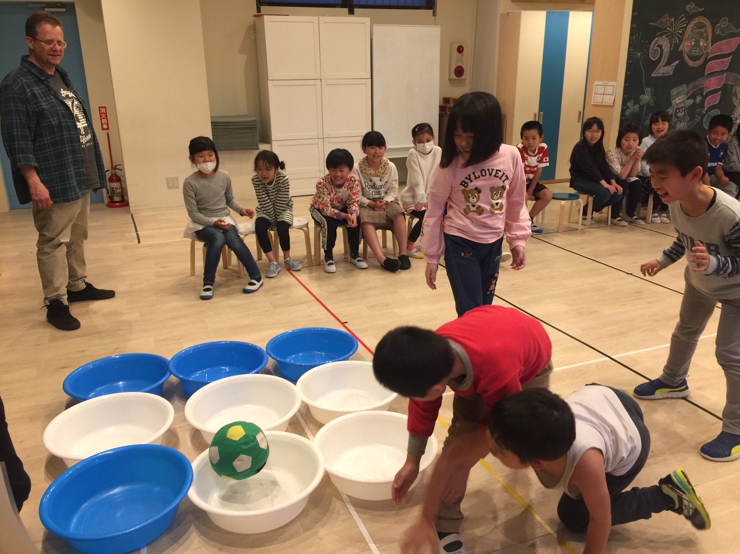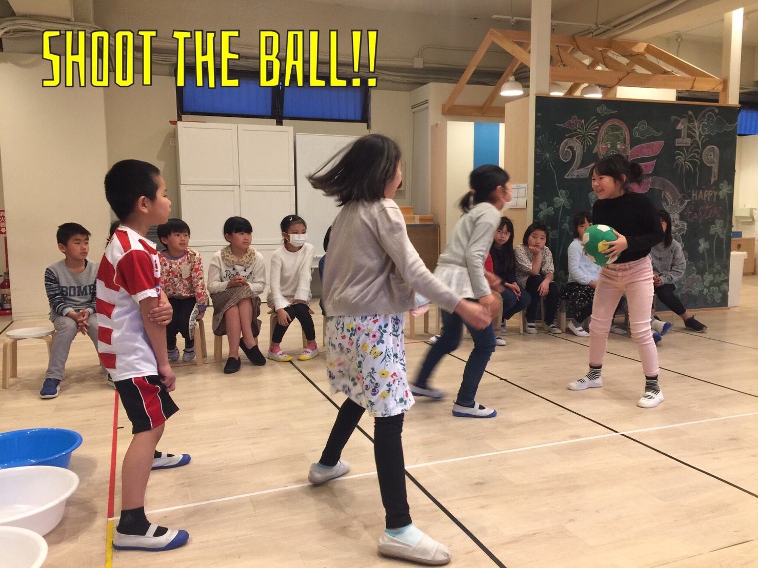 大きな声で正しく言えたら先生からボールが渡されて、床に並べてあるバケツのどれかにボールをシュート!