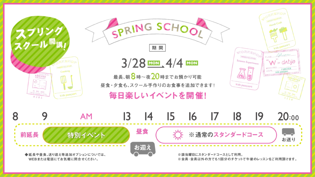 スプリングスクールは、楽しいイベントが盛りだくさんです。(内容は日によって異なります。) 小学校1年生から参加が可能です。(お申し込みの前に体験会へ一度ご参加ください)料金について